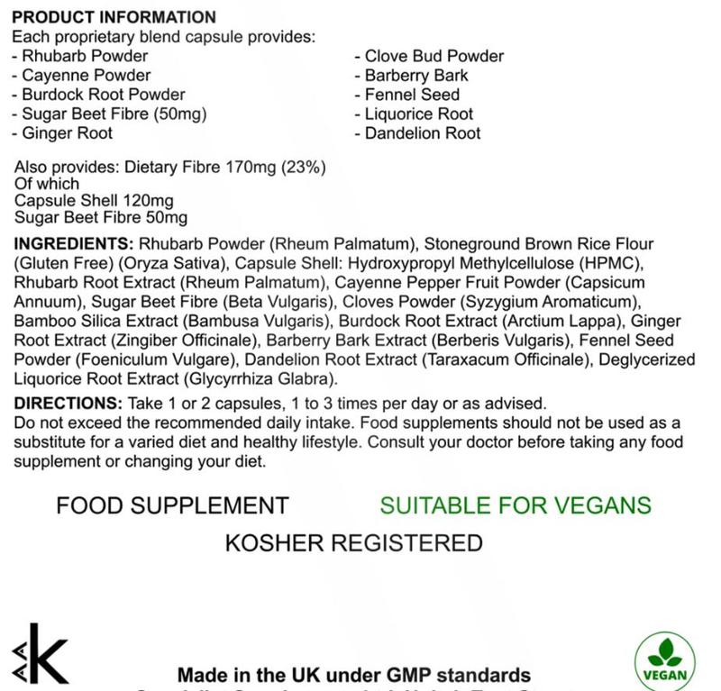Product Ingredients : Dandelion Root / Licorice Root / Fennel Seed / Berberis Bark / Clove Bud Powder / Ginger Root / Beetroot Fiber / Burdock Root Powder / Chili Powder / Rhubarb Powder